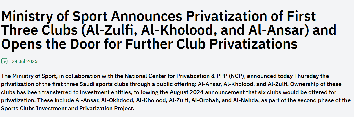 沙特体育部日前与沙特国家私有化中心(NCP)联合宣布,已通过股权转让完成了三家沙特体育俱乐部的私有化,涉及Al-Ansar、Al-Kholood和Al-Zulfi足球俱乐部。