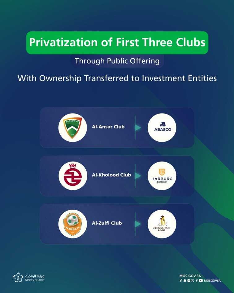 根据公告,Al-Ansar俱乐部归Oudah Al-Baladi & Sons Company所有,Al-Kholood俱乐部归属足球投资企业Harburg Group,Al-Zulfi俱乐部则由房地产投资开发公司Nojoom Al-Salam管理,这些交易将在相关监管审批完成后正式落地。