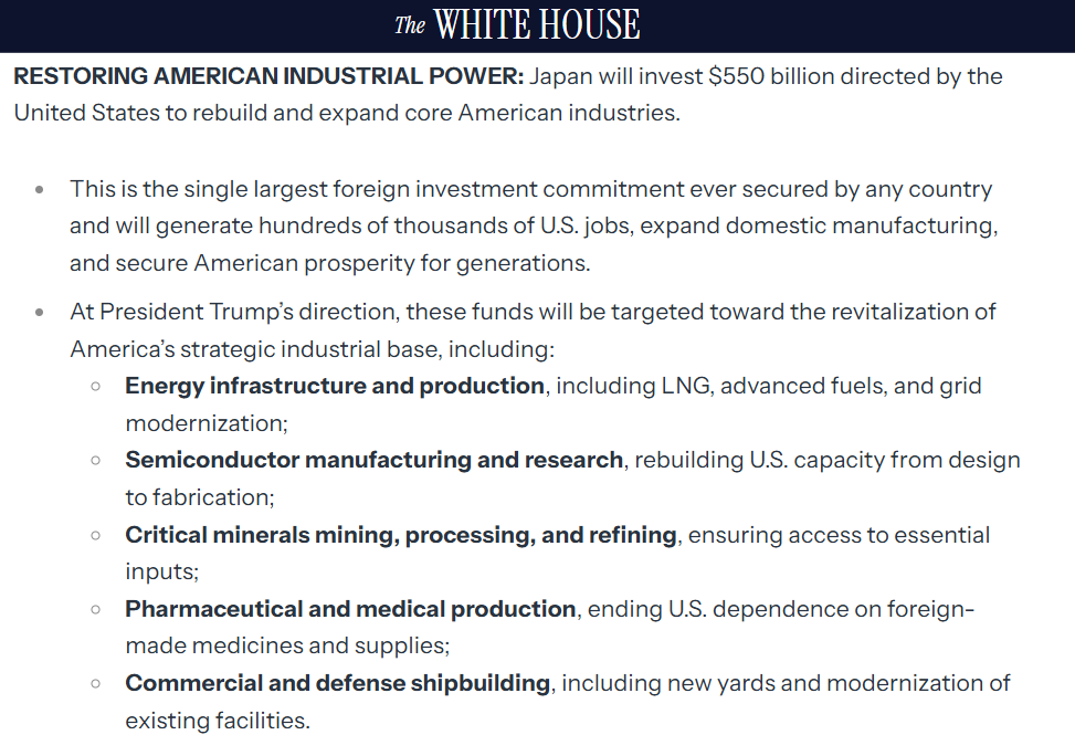 财联社7月25日讯,美日贸易协定引发市场关注,日本将向美国投资5500亿美元换取关税降低,但利润分成差异大。投资计划缺乏细节,或致双方重心错位,政治干预资本配置的风险亦不容忽视。