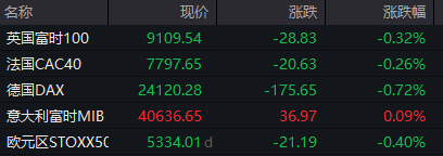 德国DAX指数跌0.72%,法国CAC40指数跌0.26%,英国富时100指数跌0.32%。