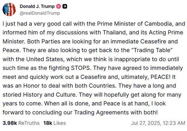 特朗普称泰国和柬埔寨都希望与美国重返“贸易谈判桌”,两国领导人已同意“立即会面并迅速达成停火协议”。