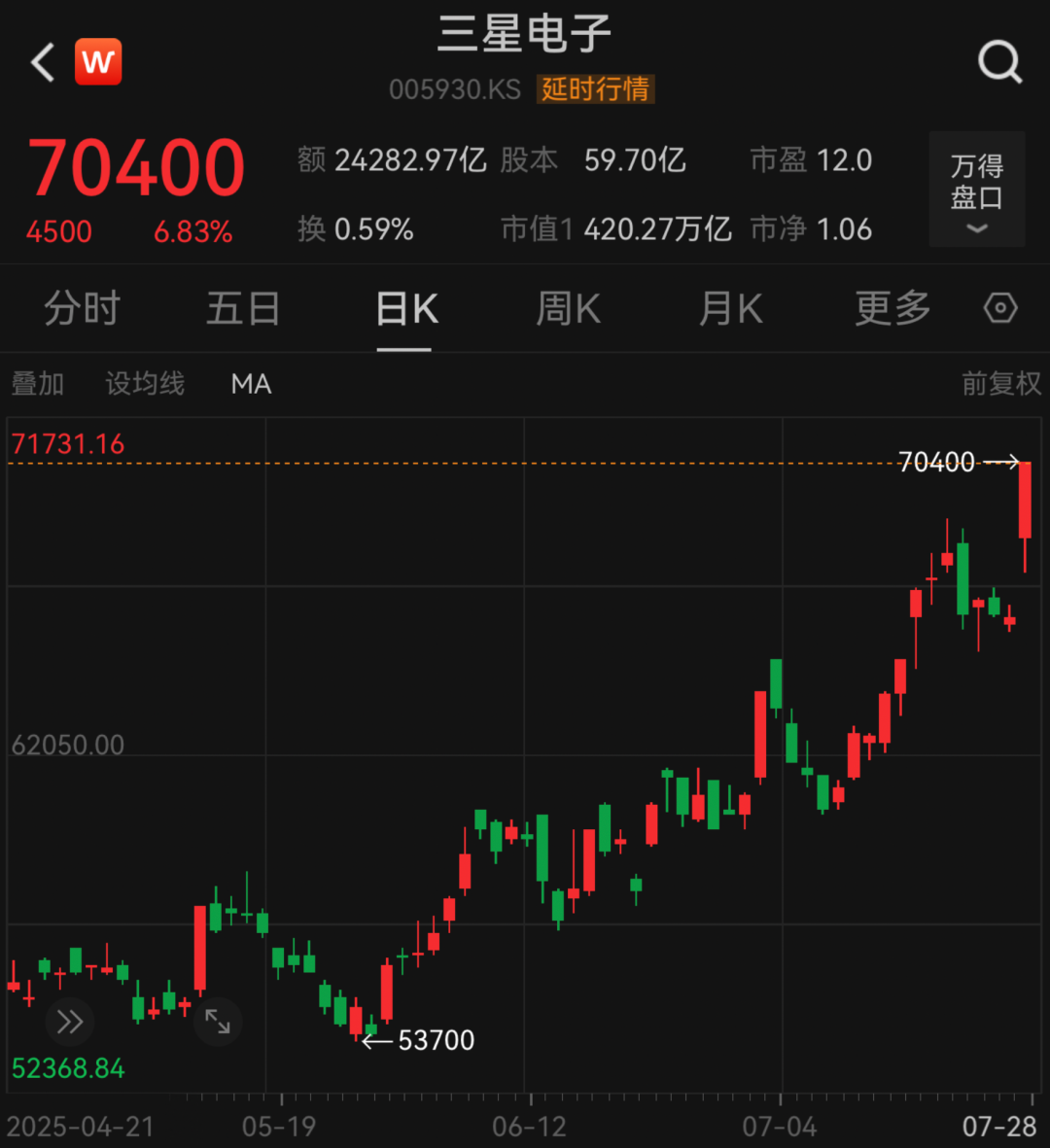 这一消息瞬间引发全球半导体行业的高度关注。受此影响,三星电子股价直线拉升,截至韩股收盘,涨幅达6.83%,报70400韩元/股,为去年9月以来最高水平。这一表现直接带动韩国股市走强,韩国综合指数收涨0.42%。