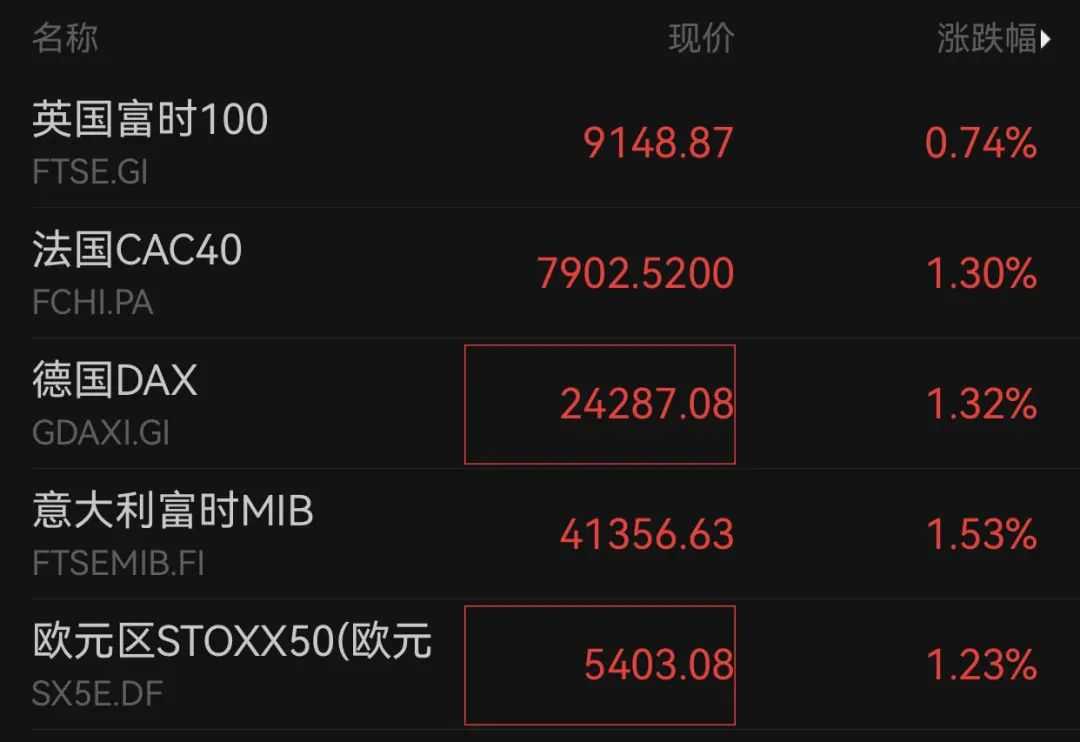 欧洲股市普涨,截至发稿,英国富时100指数上涨0.74%,法国CAC40指数上涨1.3%,德国DAX指数上涨1.32%,意大利富时MIB指数上涨1.53%。