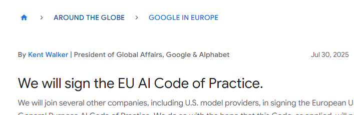 谷歌签署欧盟AI准则,担忧开发进程受影响