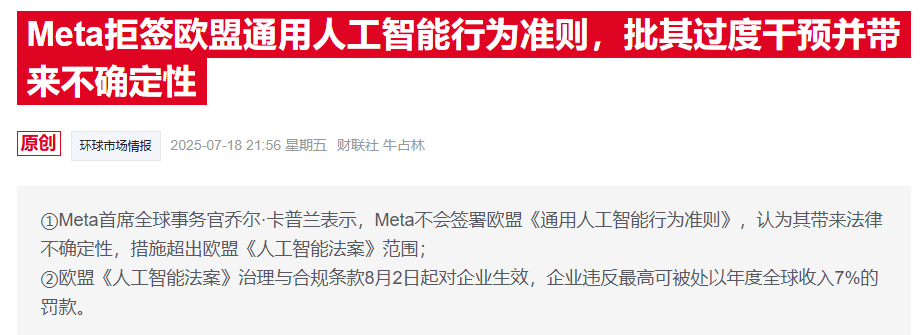 美国科技巨头谷歌最新表示,公司将签署欧盟的《通用人工智能实践准则》。此前,Meta明确表示拒绝加入,因认为这些规则可能扼杀创新。