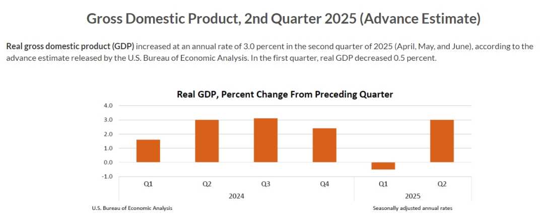 美国商务部经济分析局(BEA)周三公布的数据显示,第二季度实际GDP年化季率初值录得增长3%,超过了市场预期的2.4%。此前,由于企业为应对特朗普政府预期的关税而大量进口,第一季度GDP以0.5%的年率萎缩。