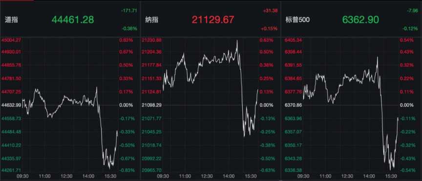 美联储利率决议发布后,美股三大指数一度全线跳水,由涨转跌,纳指尾盘勉强翻红,截至收盘,纳指涨0.15%,标普500指数跌0.12%,道指跌0.38%。大型科技股涨跌不一,英伟达涨超2%,微软、谷歌小幅上涨;苹果跌超1%,亚马逊、Meta、特斯拉小幅下跌。