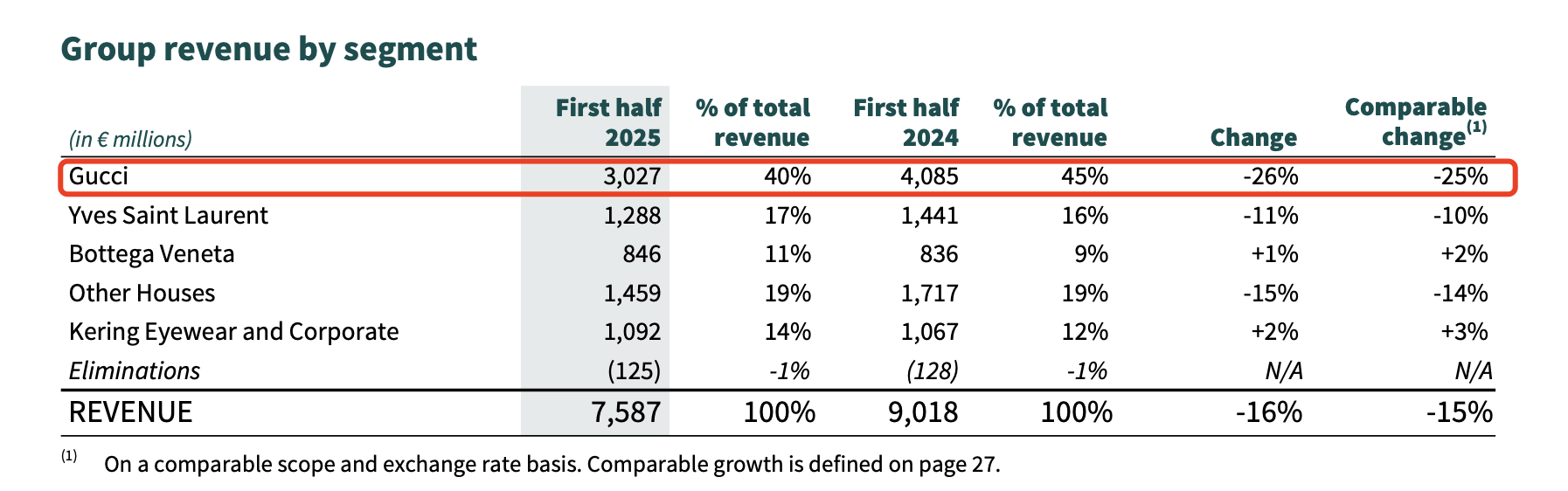 开云集团旗下拥有Gucci、Yves Saint Laurent(圣罗兰)、Bottega Veneta(葆蝶家)、Balenciaga(巴黎世家)等知名奢牌。其中Gucci一度跻身百亿欧元俱乐部,但近一年来,该主力品牌销售表现持续低迷。财报显示,Gucci2025上半年营收30.27亿欧元,按可比销售额下滑25%。