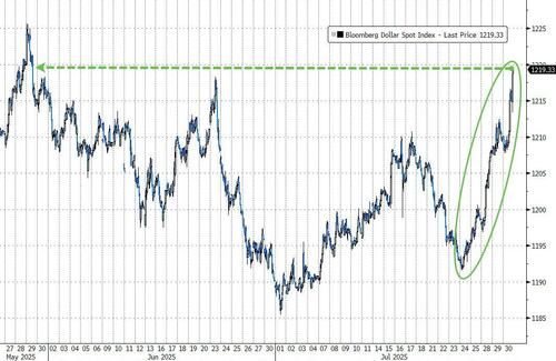 同时,年内大幅承压的美元指数则在隔夜大幅回升,彭博现货美元指数跃升至了两个月来的最高水平。