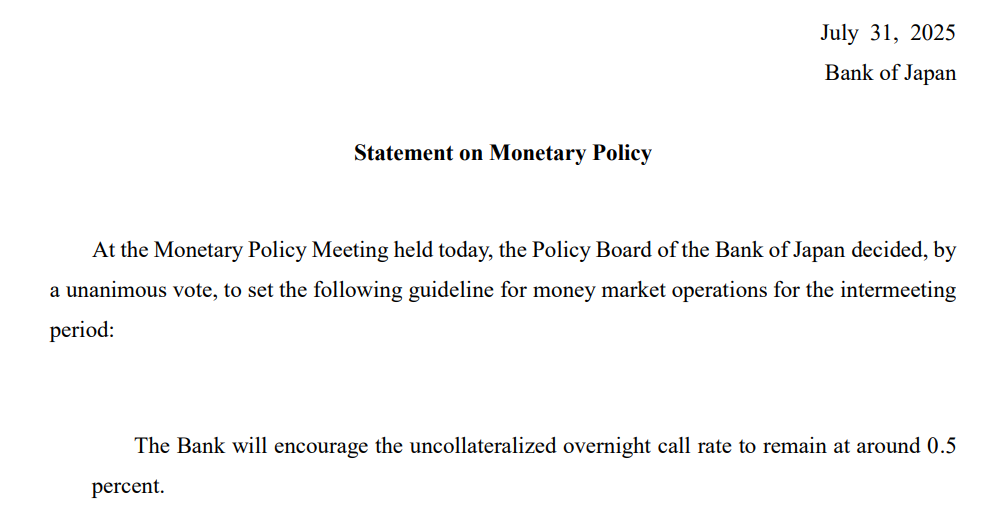 7月31日,日本央行公布利率决议,决定维持利率在0.5%不变,连续第四次会议按兵不动,符合市场预期。