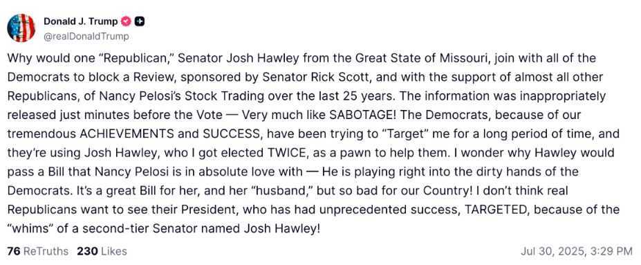 特朗普在社交媒体上谴责霍利,称其为“二流”参议员,允许民主党人将他当作“棋子”。特朗普表示,民主党人长期试图“针对”他,而霍利通过了令佩洛西倾心的法案,对国家不利。特朗普此前曾表示,如果法案送到他办公桌上,他将会签署。