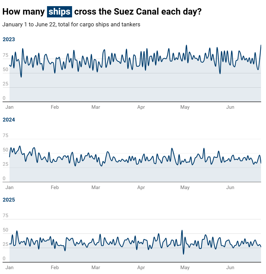 2023至2025期间,上半年每日船只通过苏伊士运河数量数据来源:IMF PortWatch