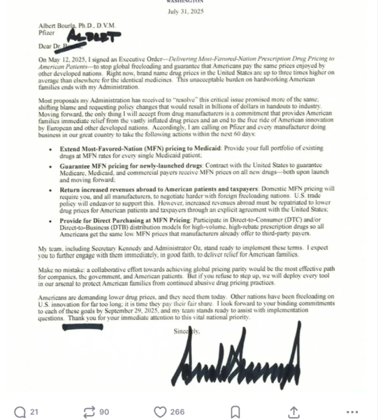 特朗普此前已签署行政命令,要求在药品领域实施“最惠国政策”,旨在通过价格挂钩大幅降低药品成本。据称,美国一些品牌药品的价格是其他发达国家的三倍多。