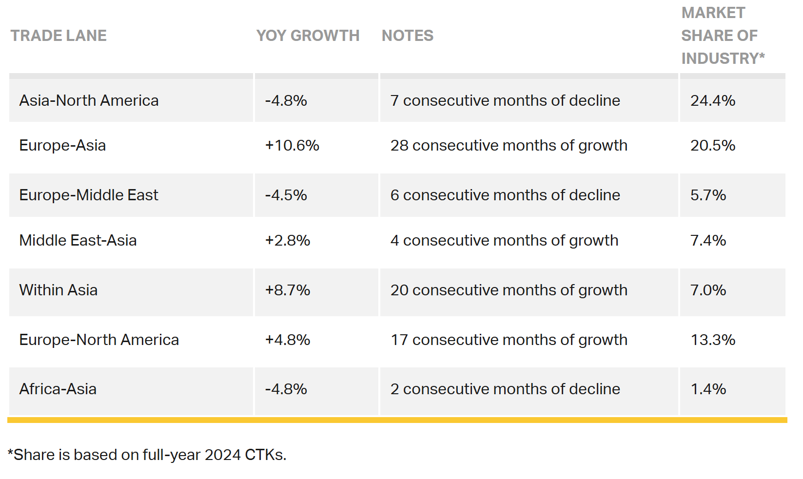 亚太地区的上涨被北美地区8.3%的下滑所抵消。北美的下滑主要出于新关税政策导致的贸易紧张局势。同期,中东地区航空公司的货运量需求下降3.2%。