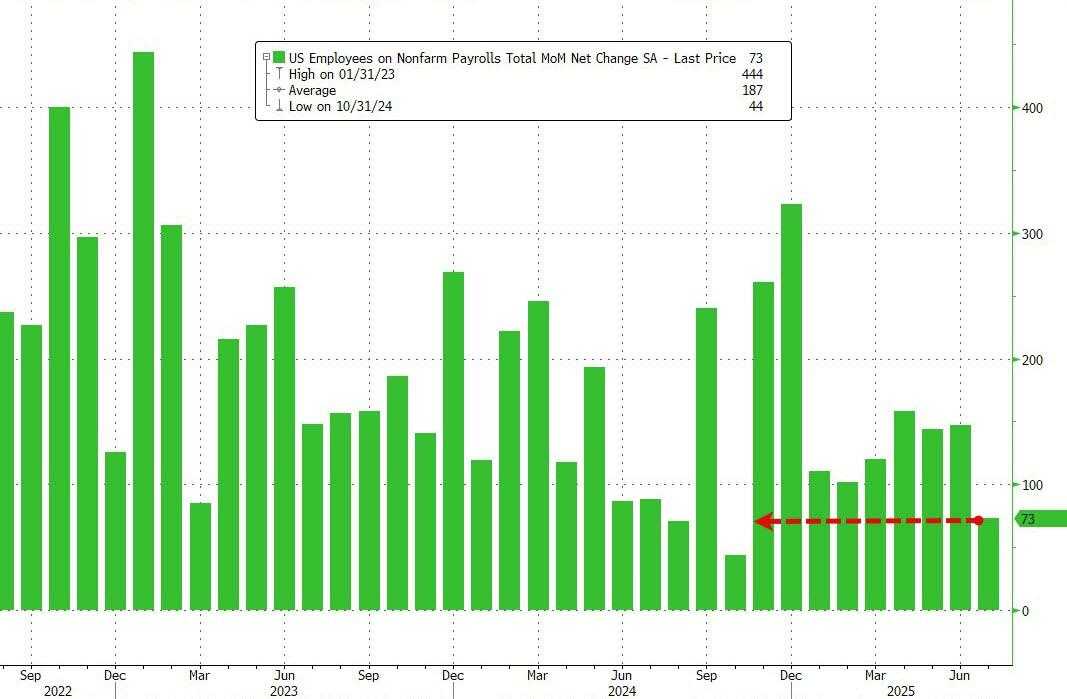 值得注意的是,5月份非农新增就业人数从14.4万人修正至1.9万人;6月份非农新增就业人数从14.7万人修正至1.4万人。修正后,5月和6月新增就业人数合计较修正前低25.8万人。此外,美国7月失业率录得4.2%,较上月回升,符合市场预期。美国7月平均时薪年率录得3.9%,为3月以来新高,略超市场预期的3.8%,这为通胀回落路径增添了一丝不确定性。美联储降息FwdBonds首席经济学家Christopher Rupkey评论称,特朗普的经济议程和政策可能开始对劳动力市场产生影响,迫使企业按下“招聘暂停键”,尤其令人不安的是,5月和6月,超过25万个就业岗位被大幅下修。从行业角度来看,医疗保健行业再次引领就业增长,创造了5.5万个新工作岗位,社会救助部门增加了1.8万个工作岗位。然而,联邦政府部门的就业人数继续下降,7月减少了1.2万人,“政府效率部”裁员效应持续显现。美国行业金融机构海军联邦信贷联盟首席经济学家Heather Long表示:“这是一份改变游戏规则的就业报告,表明劳动力市场正在迅速恶化。”数据公布后,现货黄金短线跳涨,向上触及3340美元/盎司,美元指数下挫逾100点,最低至99.11。芝商所的Fed watch工具显示,市场目前预计9月降息的可能性为73%,而非农公布前约为40%。在特朗普的关税政策影响下,美国企业正因不确定性而减少招聘。此前一天,特朗普签署行政令,将对加拿大的关税税率从25%上调至35%,并确定了对多个国家和地区征收的“对等关税”税率,具体税率从10%至41%不等。AmeriVet Securities美国利率交易与策略主管Gregory Faranello表示:“我们预计美联储将在9月开始降息。”他补充说:“令人有些惊讶的是,几天前美联储主席还在暗示劳动力市场强劲,转眼间却就迎来了这样的就业数据。”Manpower Group北美地区总裁Ger Doyle表示:“今天的非农报告进一步证实了劳动力市场缓慢但持续的降温趋势,虽然还没有陷入危机,但招聘势头继续减弱,压力开始积聚。”值得注意的是,就在非农报告发布前不久,特朗普加大了对鲍威尔的攻击力度,他写道:“杰罗姆·鲍威尔,一个顽固的白痴,现在必须大幅降低利率。如果他继续拒绝降息,美联储理事会就应该掌握控制权,做所有人必须做的事。”(文章来源:财联社)