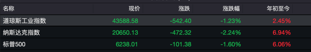 截至收盘,美国三大股指全线下跌。道琼斯工业指数跌1.23%,标普500指数跌1.60%,纳斯达克指数跌2.24%。