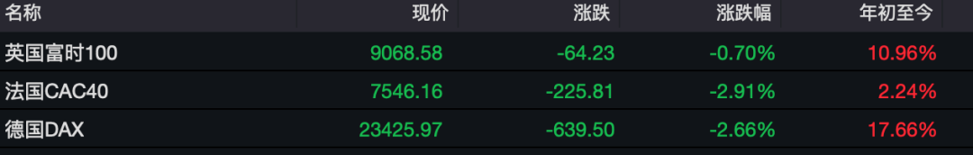 欧洲股市也全线下挫。德国DAX指数跌2.66%,本周累计跌3.27%;法国CAC40指数跌2.91%,本周累计跌3.68%;英国富时100指数跌0.7%,本周累计跌0.57%。