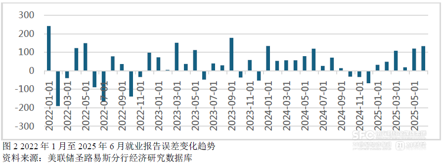 如图2,美国就业统计修正值与最初估计值差异较大。2022年1月至2025年6月共42个月中,高估占30个月,比修正值合计高出了249.7万个岗位,高估部分的月平均值为8.26万;低估占12个月,低估值合计93.1万个岗位,低估部分的月平均值为7.76万个岗位。金融市场对就业市场恶化感到深度忧虑,不过,美国劳工部统计局应深刻反思统计质量问题。