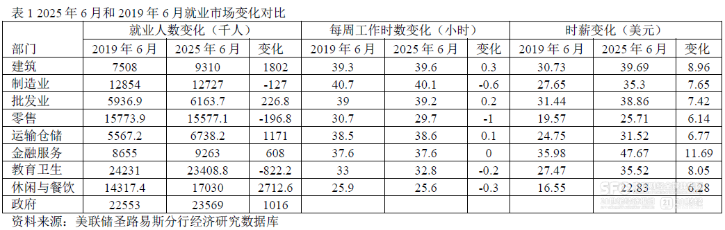 美国就业市场变化与政策目标相悖,2025年6月,美国就业人数增加了823.1万,而表中所列的建筑、批发、运输仓储、金融服务、休闲与餐饮和政府部门合计共增加了753.6万个就业岗位,占新增就业岗位的91.56%,而制造业、零售和教育卫生行业分别减少了12.7万、19.68万和82.2万个岗位。严峻的现实是美国制造业仍在衰落。