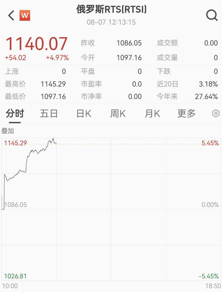 受利好消息影响,俄罗斯股市大幅拉升,俄罗斯RTS指数盘中涨幅超5%。