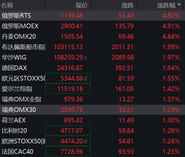 截至券商中国记者发稿时,俄罗斯RTS指数、MOEX指数分别上涨4.92%、4.91%,德国DAX30指数涨1.64%,法国CAC40指数涨1.23%。