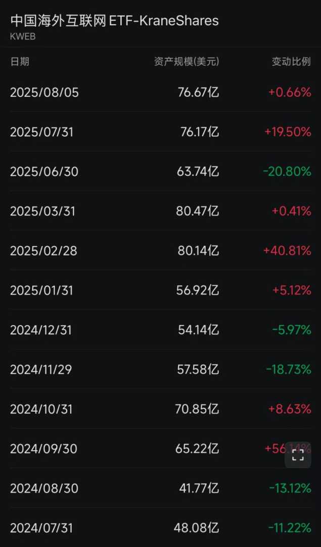 以中国海外互联网ETF-KraneShares为例,截至8月5日,该ETF资产管理规模为76.67亿美元,相较于去年年底的54.14亿美元增长超过40%。