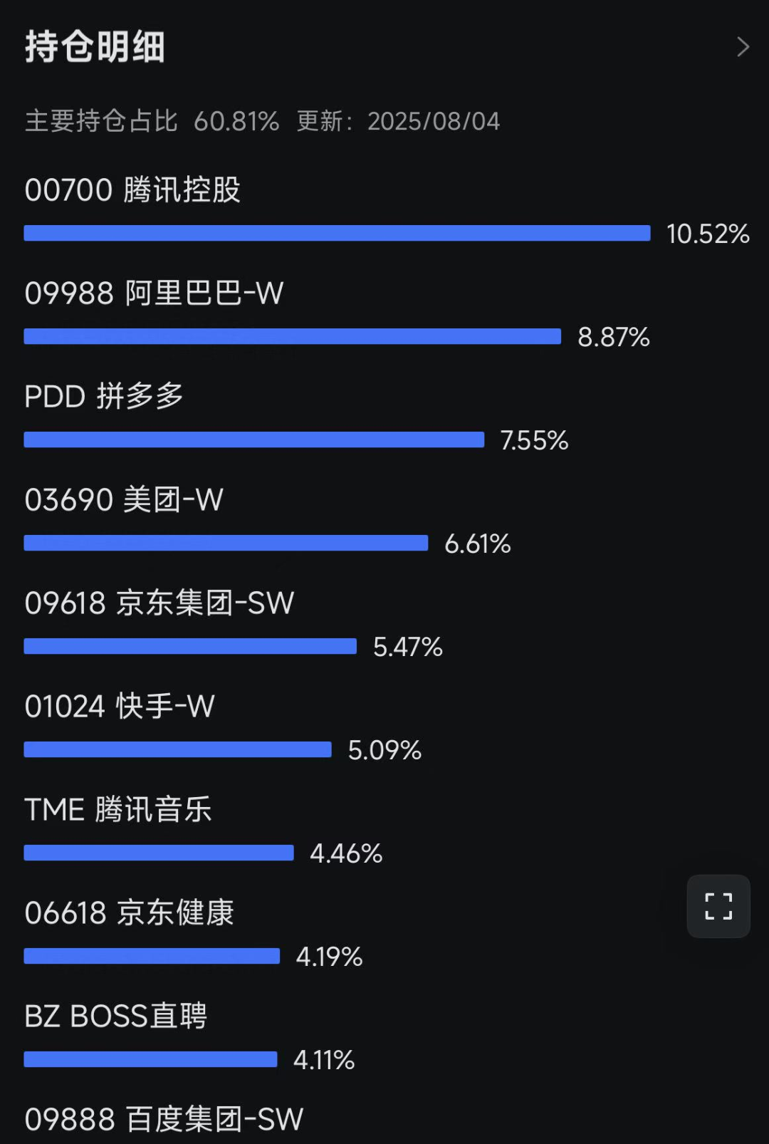 截至8月4日,该ETF前两大成分股分别为腾讯控股和阿里巴巴-W,二者在持仓中合计占比近20%。