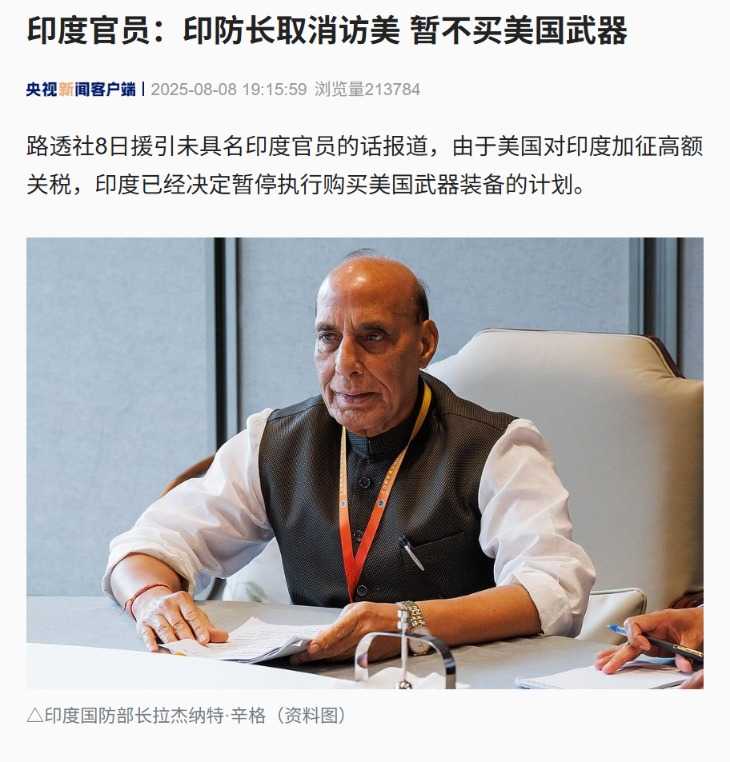 路透社8日援引未具名印度官员的话报道,由于美国对印度加征高额关税,印度已经决定暂停执行购买美国武器装备的计划。