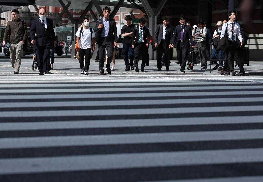 5月15日,在日本东京,行人通过东京站附近的一处人行横道。新华社记者贾浩成摄