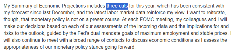 “鉴于基础通胀正持续向2%目标回落,总需求疲软,以及劳动力市场出现脆弱迹象,我认为我们应将关注点放在就业目标面临的风险上。”