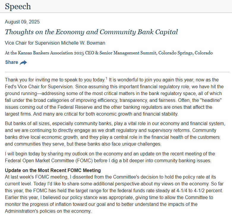 更为重要的是,美联储官网发布了负责监管的美联储副主席米歇尔·鲍曼的最新讲话稿。米歇尔·鲍曼表示,支持在2025年年内降息三次,并表示这一立场因美国近期疲弱的劳动力市场数据而得到了强化。
