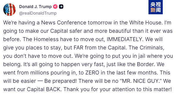 央视新闻消息,特朗普宣布将华盛顿特区警察局置于联邦管辖,并部署国民警卫队重建秩序,同时宣布进入公共安全紧急状态,计划驱逐市区无家可归者。