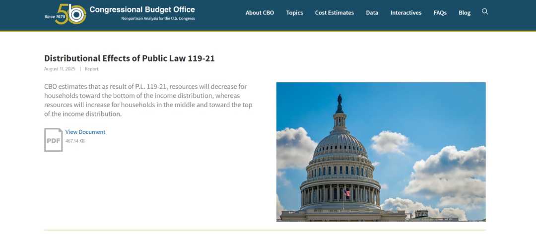 据国会预算办公室称,对美国较贫困家庭来说,“大而美”法案将使他们愈发难以获得美国社会支出项目带来的好处(比如更难获得医疗补助和食品券);而对富人来说,他们却可以依靠“大而美”法案获得更多税收优惠和现金转移。此法案加剧了美国社会贫富差距,引发了广泛关注。