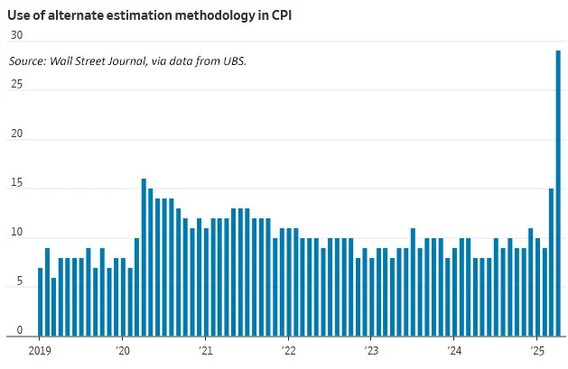 CPI数据的产生需要庞大而细致的基层采价工作。然而,当遇到样本不足或缺失时,BLS则采用插补估算来填补空缺数据。2025年4月美国CPI统计中,基于不同地区或替代商品的“不同单元”价格插补占比出现明显跃升,表明当月更多价格是通过估算得出。进入2025年,在采样缩减后,CPI数据对插补的依赖程度再次提高。据BLS介绍,4月起采样缩减导致需要插补估算的价格数量显著增加,调查响应率则有所下降。这种方法虽可保持指数连贯发布,但也意味着CPI统计对实际市场价格的覆盖度在降低,数据质量面临新的不确定性。