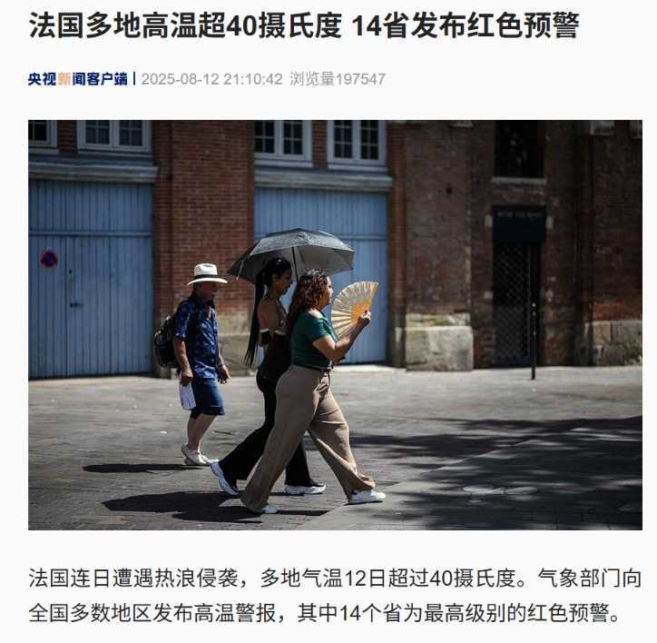 据央视新闻报道,法国连日遭遇热浪侵袭,多地气温12日超过40摄氏度。气象部门向全国多数地区发布高温警报,其中14个省为最高级别的红色预警。