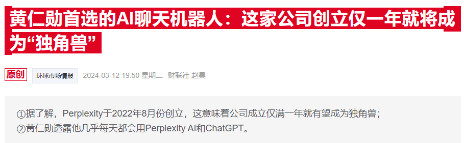 财联社报道提到,英伟达CEO黄仁勋曾透露他几乎每天都会用Perplexity AI和ChatGPT。