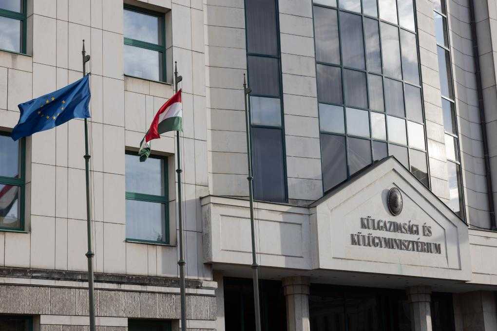 这是7月1日在匈牙利布达佩斯的匈牙利外交部大楼外拍摄的欧盟和匈牙利旗帜。新华社发(弗尔季·奥蒂洛摄)