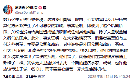 对此,特朗普在帖子中反驳称:“消费者在大多数情况下并没有支付关税,而是由公司和政府(其中许多是外国政府)承担。”