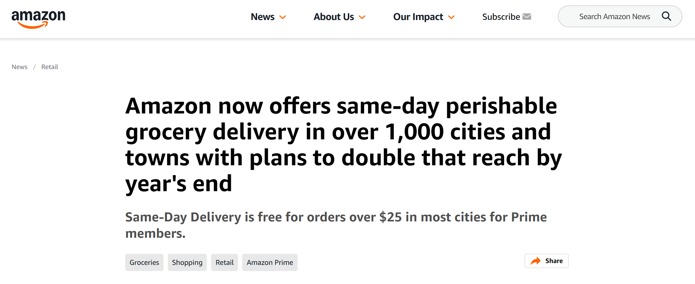 在公告中,亚马逊宣布向超过1000个美国城市和乡镇提供生鲜易腐食品的同日送达服务,并计划在年底将业务范围扩展至超过2300个地区。