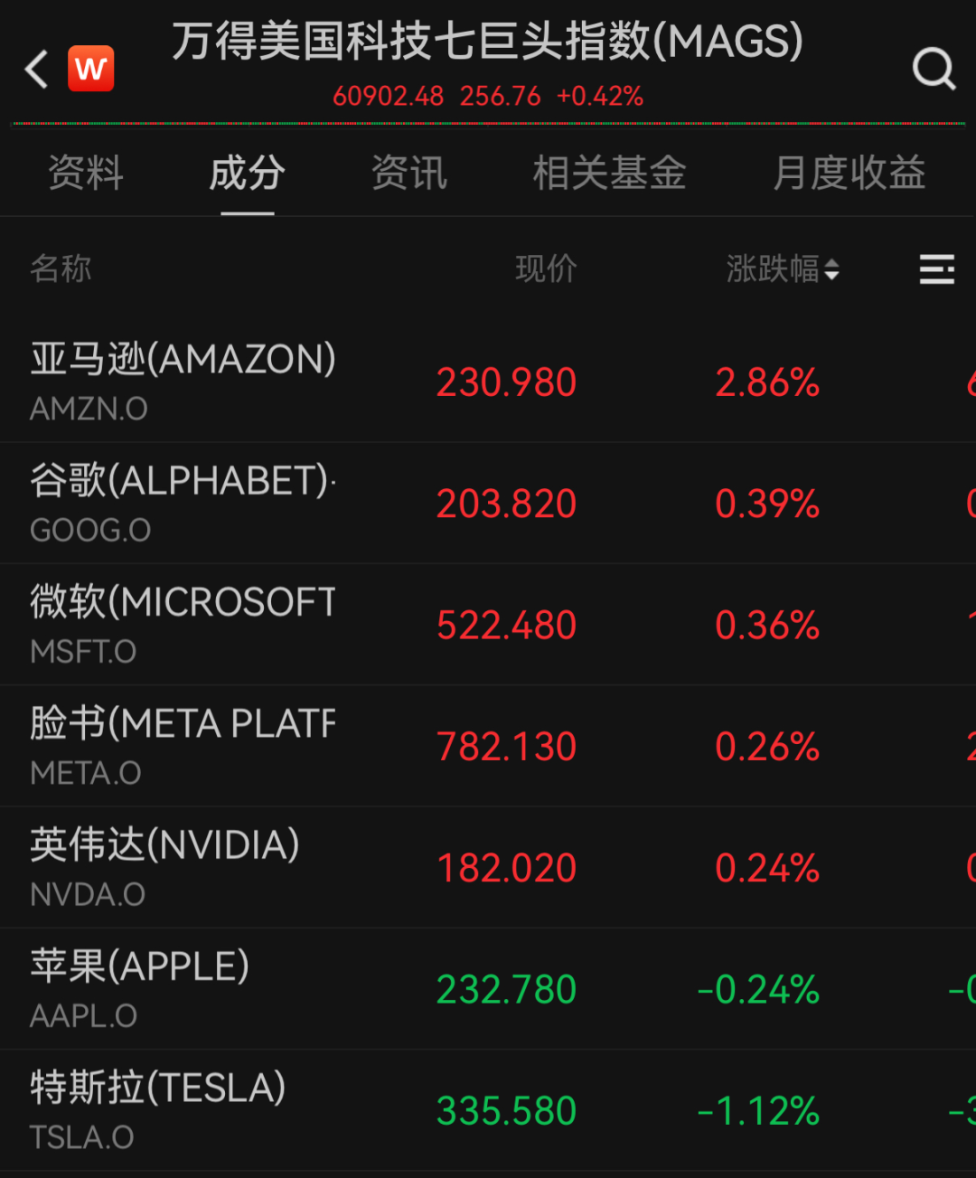 大型科技股多数上涨,万得美国科技七巨头指数涨0.42%。个股方面,亚马逊涨超2.8%,谷歌涨0.39%,微软涨0.36%,Meta涨0.26%,英伟达涨0.24%,苹果跌0.24%,特斯拉跌逾1%。