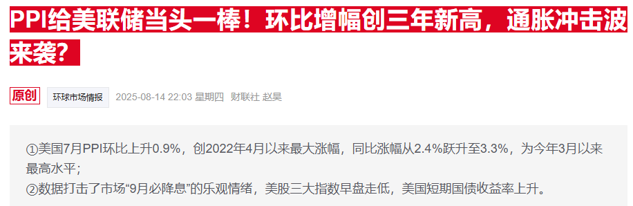 周四公布的数据显示,美国7月PPI环比上升0.9%,上一次达到0.9%还是在2022年的5月和6月;服务业通胀是推动PPI上涨的主要因素,环比上涨了1.1%,创下2022年3月以来的最大涨幅。