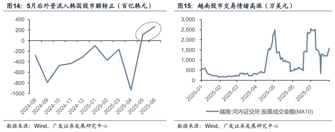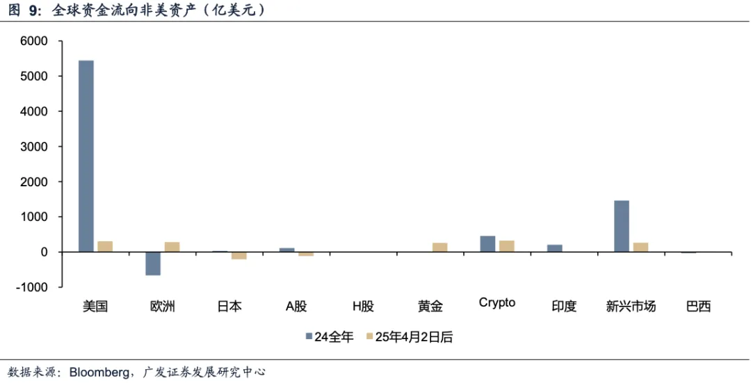 本轮全球资金再平衡的逻辑是,在美国基本面、美元和美债信用的走弱的背景下,美联储被迫重启降息,资金流向短期景气度强于美国的非美资产。在上述逻辑下,以下资产或将持续受到全球资金青睐:(1)与美元具有直接替代性质的黄金、Crypto等避险资产。(2)财政或货币政策转向、基本面具有复苏预期的其他发达国家资产(如欧元、欧股、日元等)。(3)其他基本面或政策面存在重要边际变化,且兼具胜率和赔率的新兴市场资产(如韩国、越南、巴西等)。A股作为新兴市场的重要资产,在非美强于美元资产的资金流动逻辑下,具有较大的吸引外资的潜力。