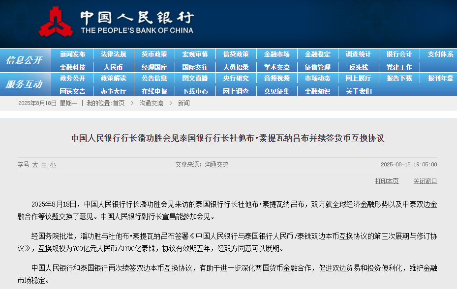 中国人民银行官网发布消息,2025年8月18日,中国人民银行行长潘功胜会见来访的泰国银行行长社他布·素提瓦纳吕布,双方就全球经济金融形势以及中泰双边金融合作等议题交换了意见。此次会面体现了中泰两国在金融领域的紧密联系与合作意愿。