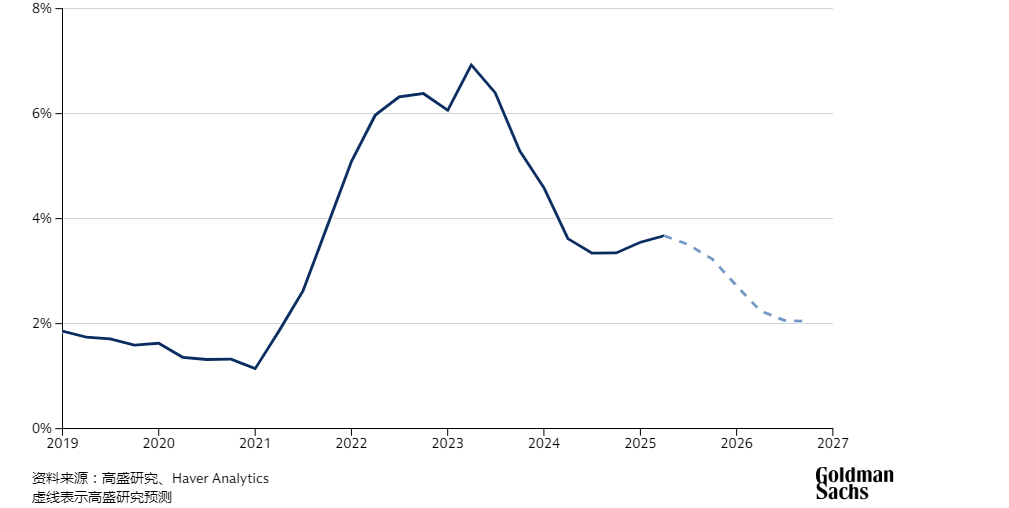 鉴于就业市场日益疲软,薪酬增长放缓,高盛团队预计,今年下半年,英国基础服务业通胀将稳步降温。总体通胀率预计将在9月份达到3.8%的峰值,然后在2026年上半年显著放缓。该团队预计,到明年下半年,英国的通胀水平将与其它发达经济体更加接近。