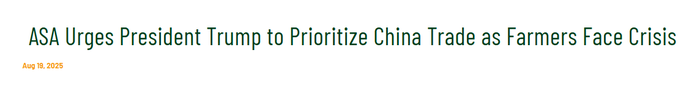 美国大豆协会当地时间8月19日发文称,“强烈敦促特朗普政府达成协议,重新开放中国这个对美国大豆至关重要的市场”。