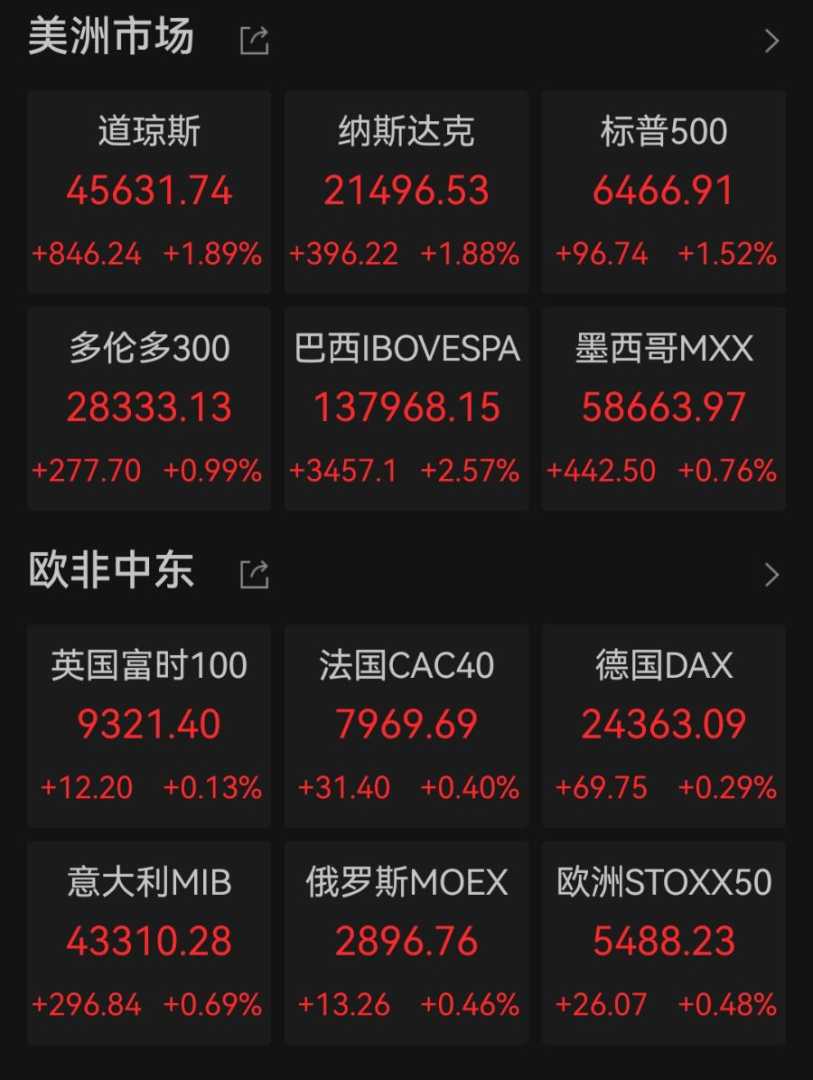 受此影响,欧美股指集体收涨,美股三大指数均涨超1.5%,其中道指创下历史新高。大型科技股普涨,热门中概股普涨,纳斯达克中国金龙指数收涨2.73%。