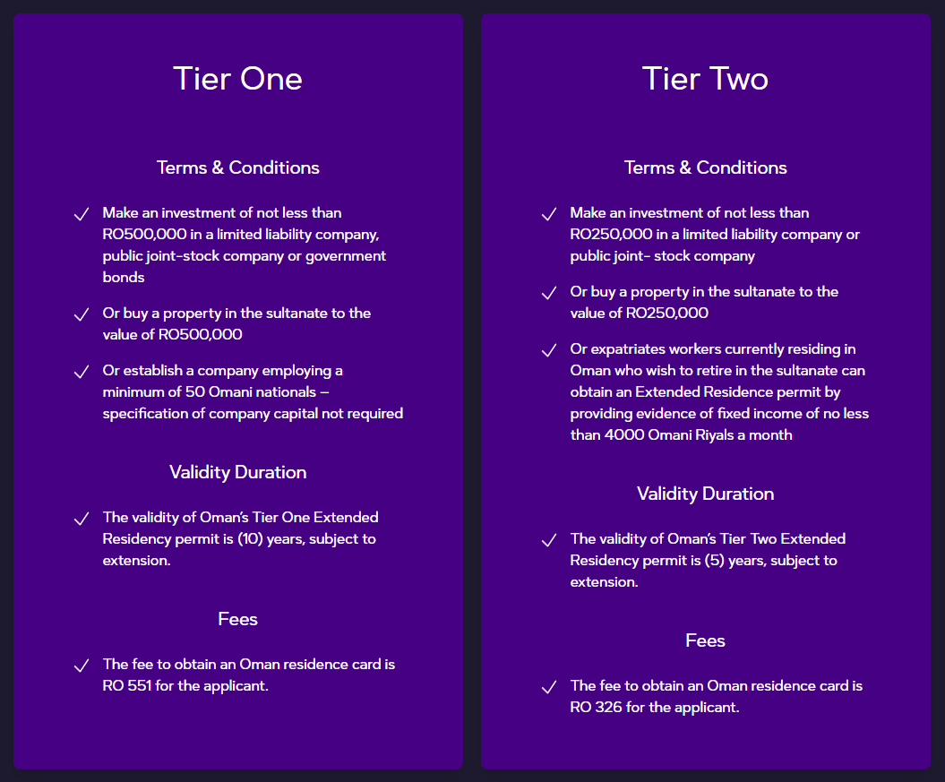 同时,在有限责任公司或公共股份公司投资25万里亚尔(约465万人民币),或购买等值房产的人,将有资格获得五年签证。居住在阿曼并希望在该国退休的外籍人士,也可通过提供每月至少4,000里亚尔(约74,388元人民币)固定收入的证明,申请为期五年的延长居留许可。