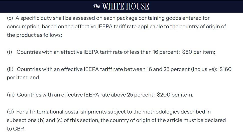 根据最新的行政命令,美国可能对关税税率低于16%的国家的每件商品征收80美元的关税;对关税税率在16%至25%之间的国家的商品征收160美元的关税;对关税税率高于25%的国家的商品征收200美元的关税。这一政策变动无疑将加剧国际贸易的紧张局势。