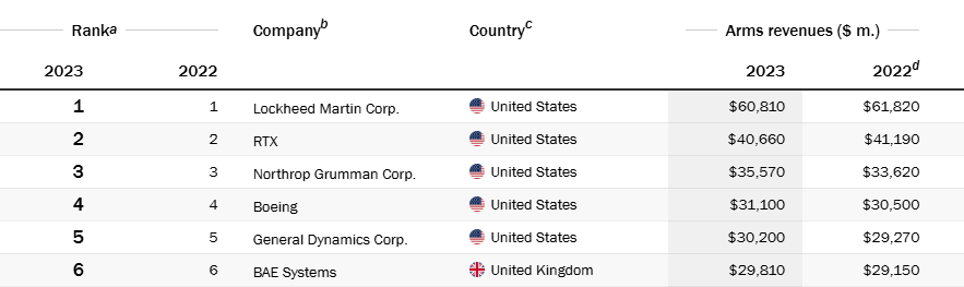 洛克希德-马丁公司是全球最大军工企业,在瑞典斯德哥尔摩国际和平研究所(SIPRI)2023年的全球军火商百强排名中位居榜首,其军火销售额比第二名雷神公司还高出了近50%,彰显军工实力(军工实力)。