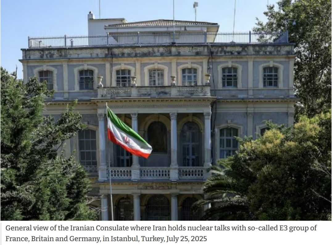 △当地时间7月25日,伊朗与英国、法国、德国在位于土耳其伊斯坦布尔的伊朗驻伊斯坦布尔总领馆内进行了约4小时的闭门会谈。这是以色列与伊朗6月24日停火以来,伊朗与英法德首次就伊核问题举行正式线下会谈。(伊朗国际电视台网站报道配图)
